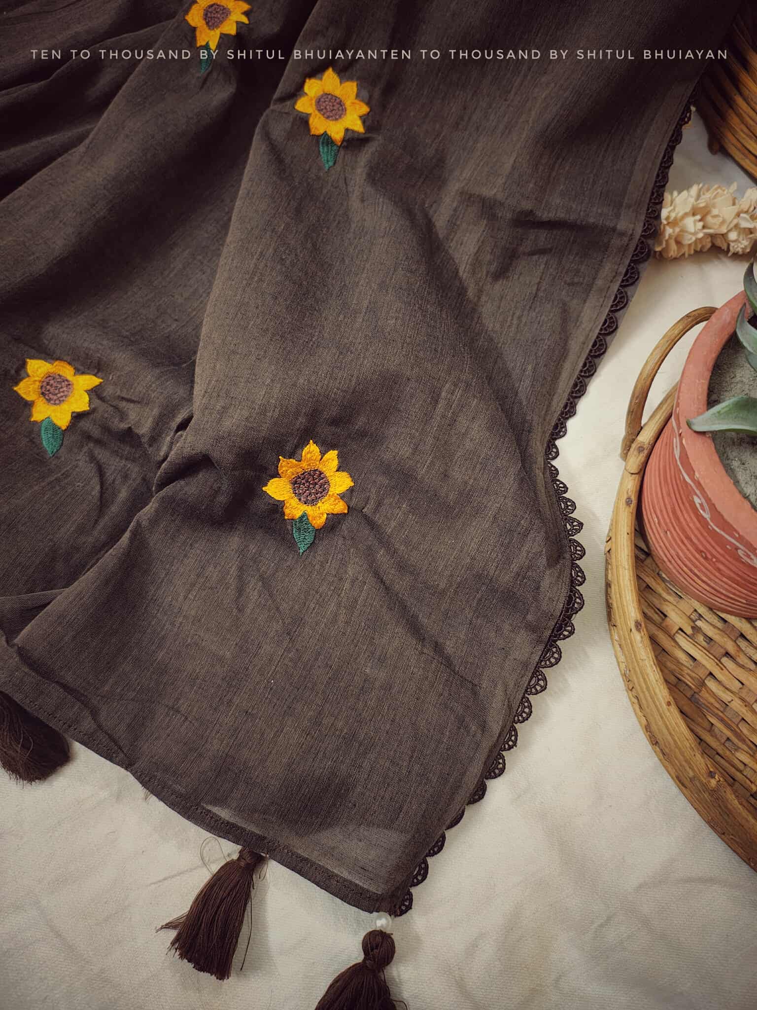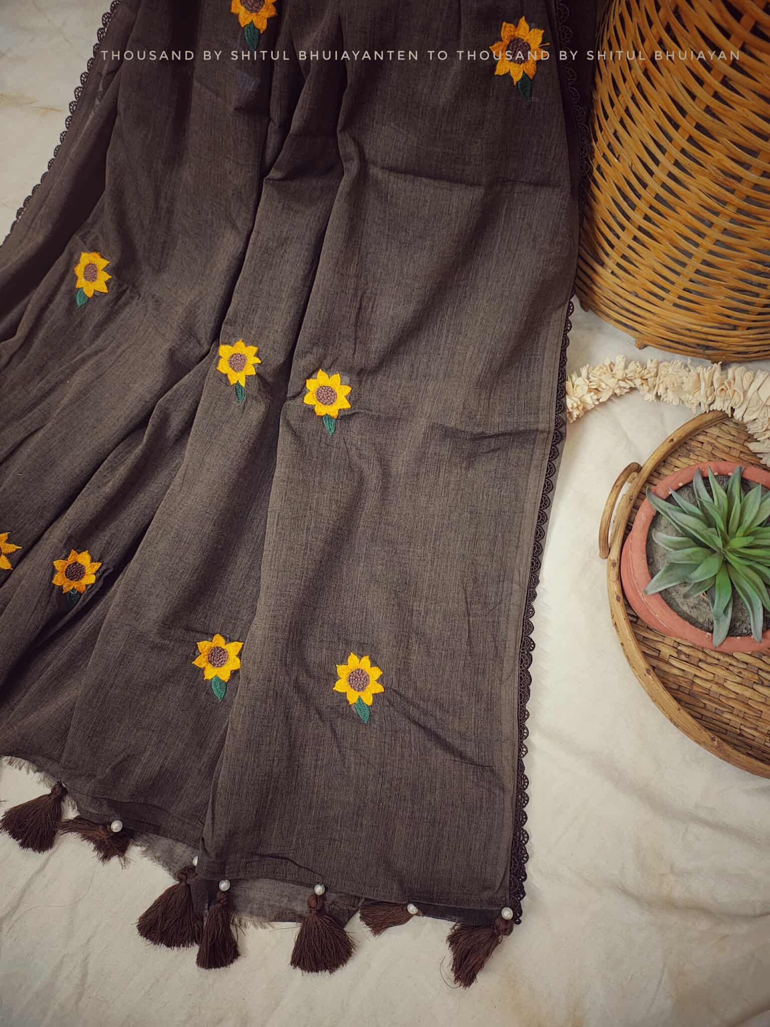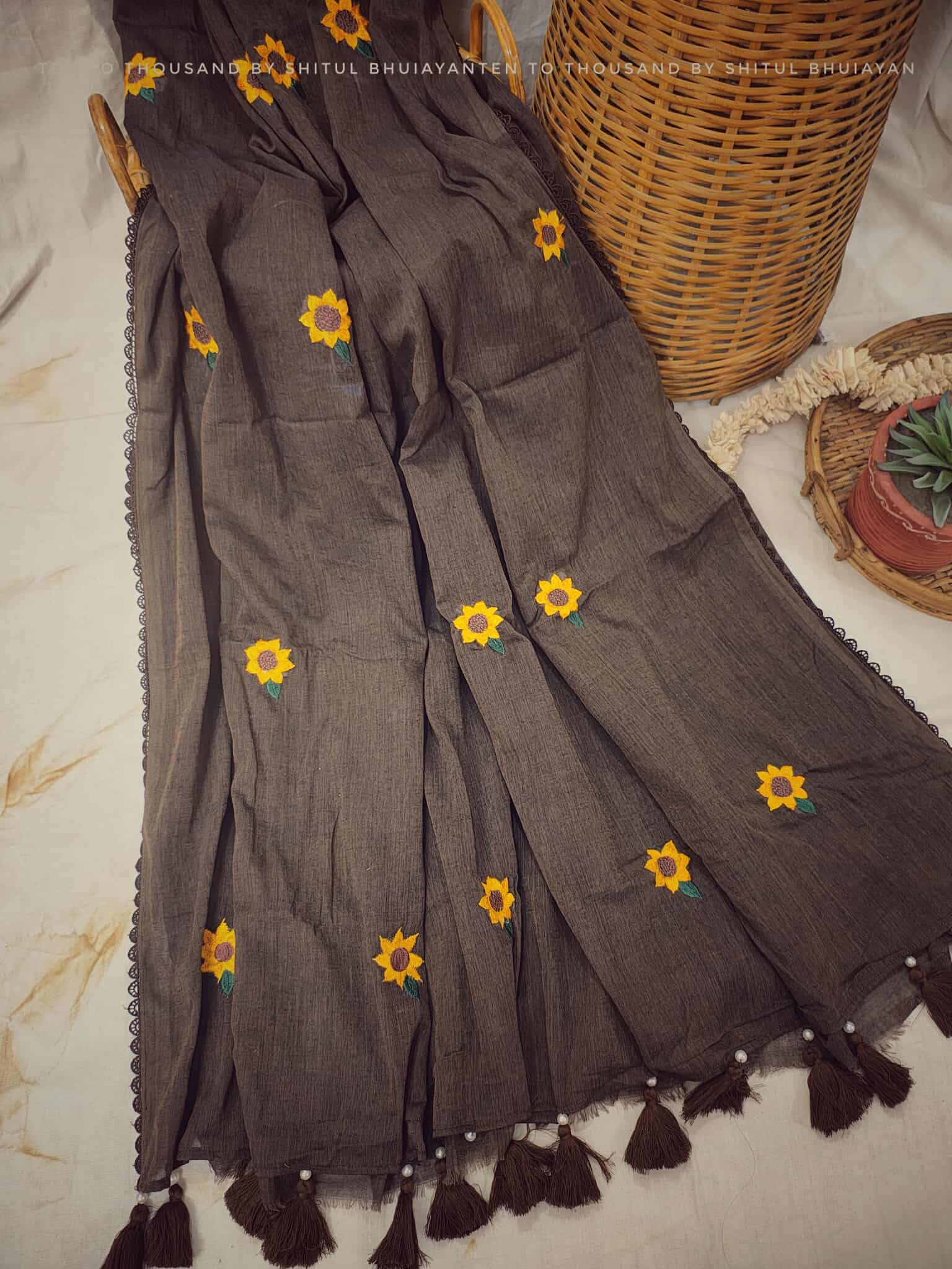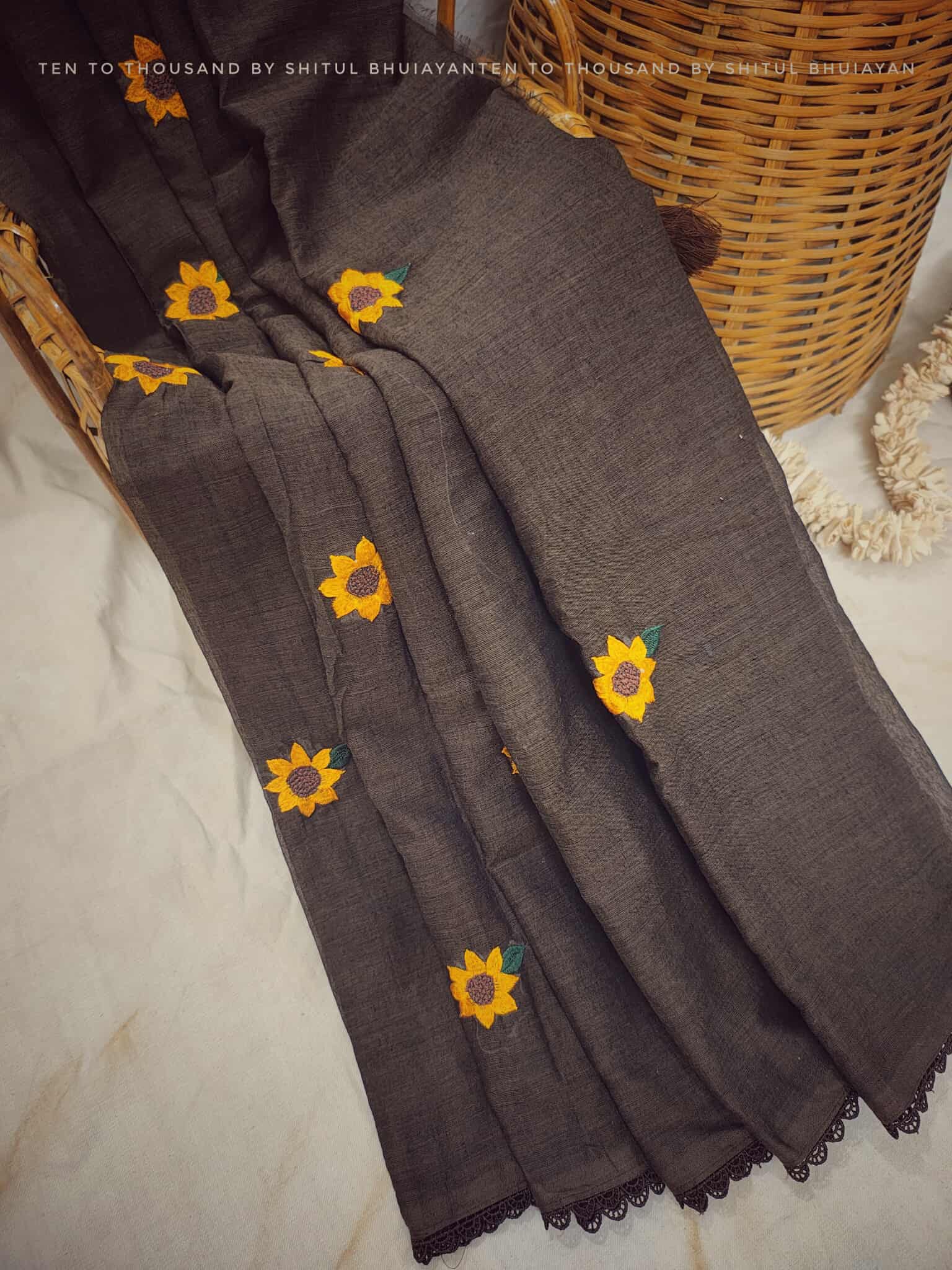 আরাম আরাম নরম তুলতুলে ব্লাউজপিস সহ সুতি শাড়িতে এম্ব্রয়ডারি। পুরা শাড়িতে লেস ওয়ার্ক করা।আঁচলে টার্সেল থাকবে!টার্সেল সহ ৭ গজ শাড়ি।১ গজ ব্লাউপিস কাটবেন।